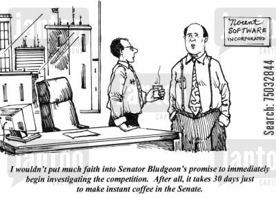 Cartoon – Competition Posted on November 16, 2015 by henrykotula Posted in Uncategorized Tagged Antitrust, Cartoon, Competition Leave a comment ‘I wouldn’t put much faith into Senator Bludgeon’s promise to immediately begin investigating the competition. After all, it takes 30 days just to make instant coffee in the Senate.’ Share this: Click to share on X (Opens in new window) X Click to share on Facebook (Opens in new window) Facebook Click to share on LinkedIn (Opens in new window) LinkedIn Like Loading... Related