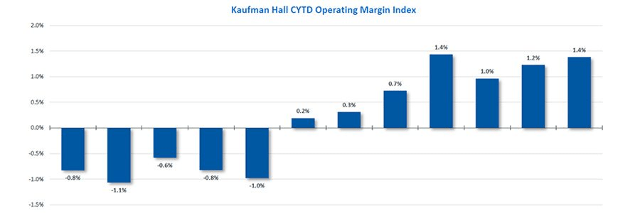 While hospitals’ overall performance declined slightly in September compared to the previous month, the median Kaufman Hall Calendar Year-To-Date Operating Margin Index reflecting actual margins was 1.4% in September. This slight increase was due to the historical variation in the performance of hospitals across 2023.
