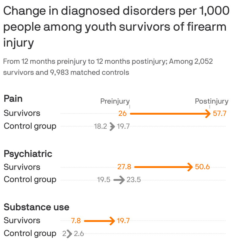 In the year after being shot, survivors had a 117% increase in pain disorders including musculoskeletal pain and headaches compared with the control group, with a 293% increase for those more severely wounded.