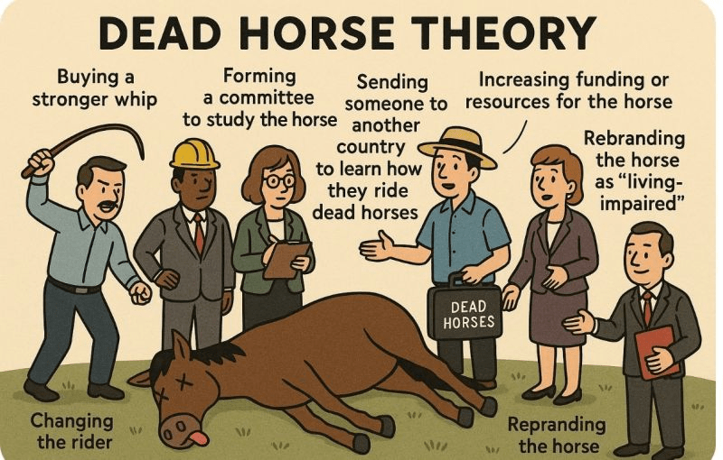 Cartoon – The Dead Horse Theory Posted on May 13, 2025 by henrykotula Posted in Cartoon, Dead Horse Theory, Leadership Legacy, Sign of the Times Leave a comment Share this: Click to share on X (Opens in new window) X Click to share on Facebook (Opens in new window) Facebook Click to share on LinkedIn (Opens in new window) LinkedIn Like Loading...
