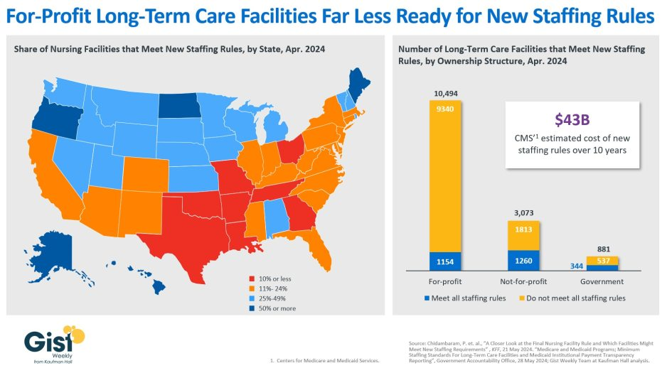 Facilities in Texas are the least ready, with only 4% meeting the new staffing minimums. In terms of ownership structure, only 11% of for-profit facilities—which constitute nearly three quarters of all LTC facilities nationwide—have staffing levels that meet the new staffing minimums.