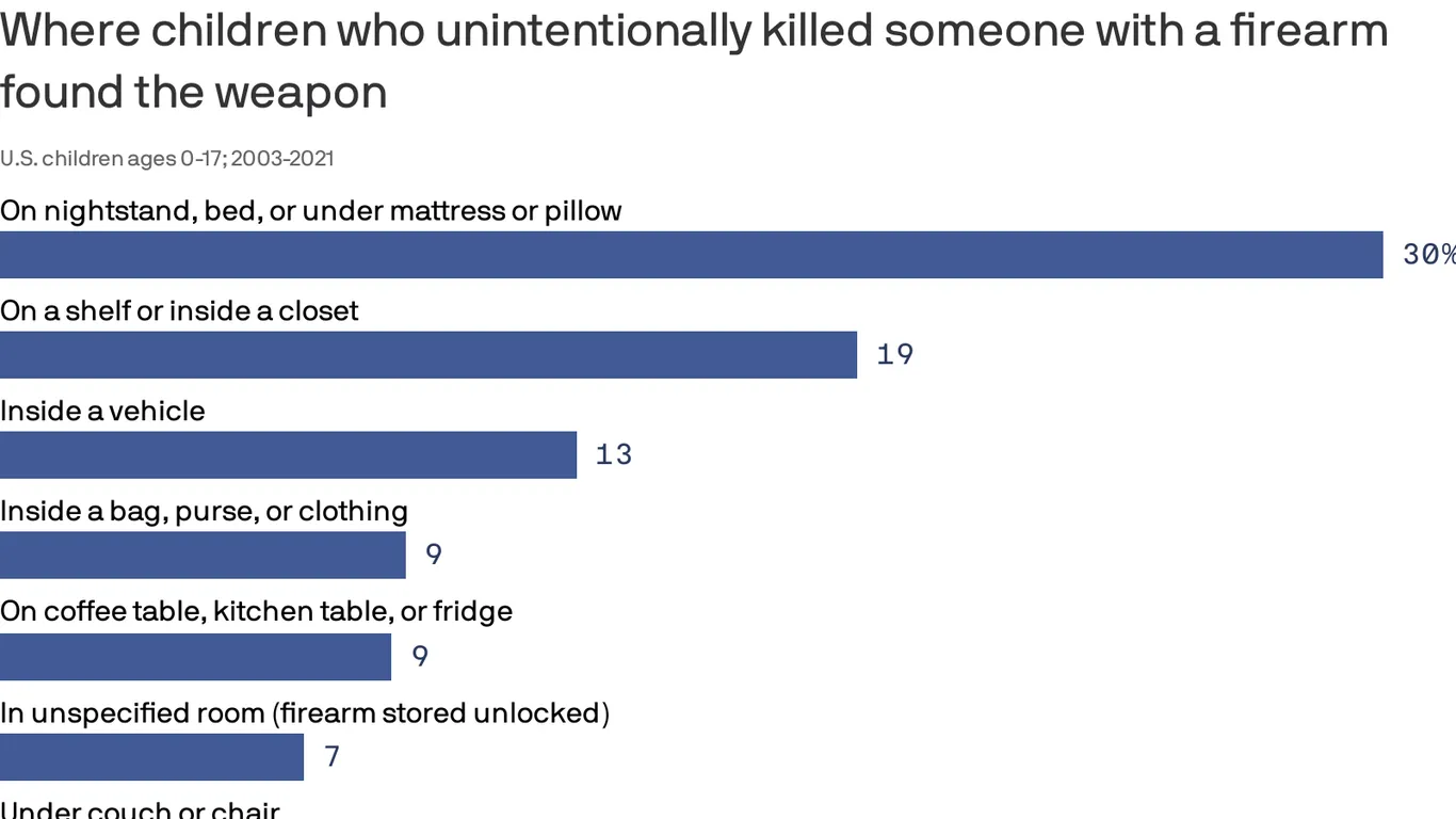 In 30% of deaths, guns were found around nightstands and other sleeping areas.