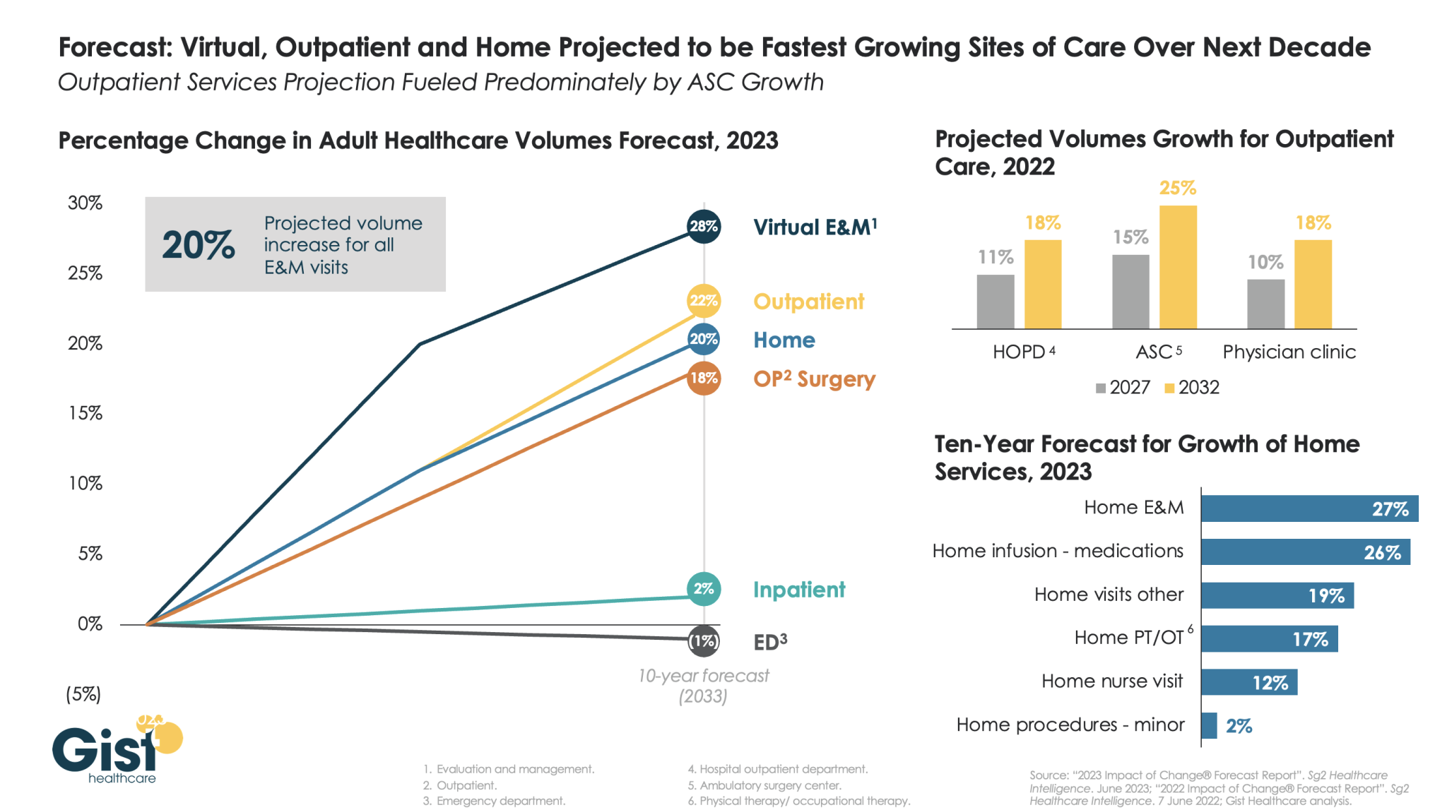 Using the latest forecasting data from strategic healthcare consulting firm Sg2, the graphic above illustrates how the outpatient shift will continue to accelerate in the coming years. With each projected to grow by 20 percent or more, outpatient, virtual, and home-based care services will continue far outpace growth in hospital-based care over the next decade.