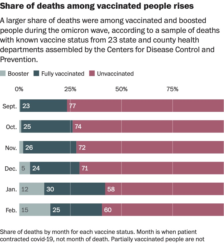 The Post calculated the share of deaths by vaccine status from the sample of death records the CDC used to calculate death incidence rates by vaccine status. As of April, that data included 44,000 deaths of people who contracted covid in January and February.