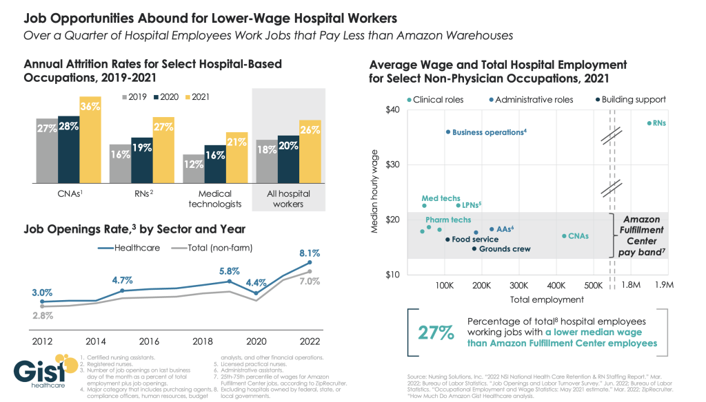 As we’ve been discussing, the COVID pandemic and ensuing economic environment have driven health system job vacancies and attrition rates to all-time highs. Right now, for myriad reasons, many hospital workers are deciding that the financial, emotional, and professional benefits of working for a hospital are outweighed by the toll working in a hospital takes on them personally.