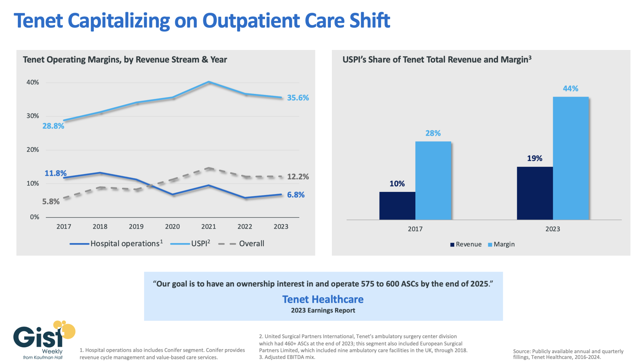 Tenet has pursued this growth aggressively since buying USPI in 2015, swelling its ASC footprint from 249 locations in 2015 to more than 460 in 2023, with plans to increase that number to nearly 600 by the end of next year.