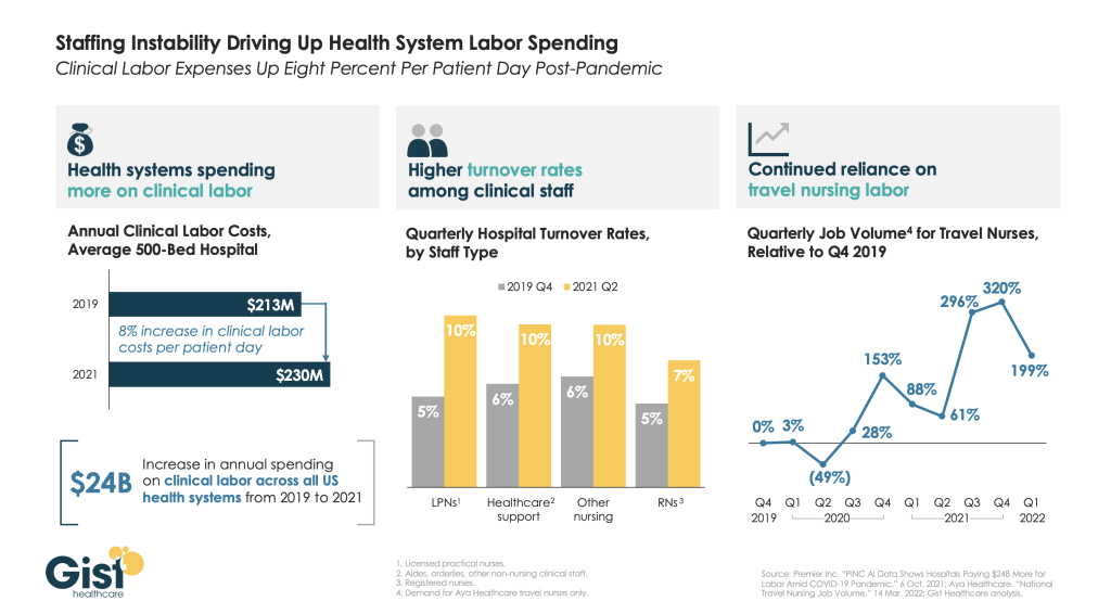 The hospital workforce is central to the care process and often the largest expense for hospitals. It is no surprise then that even before the pandemic, labor costs — which include costs associated with recruiting and retaining employed staff, benefits and incentives — accounted for more than 50% of hospitals’ total expenses. Therefore, even a slight increase in these costs can have significant impacts on a hospital’s total expenses and operating margins.