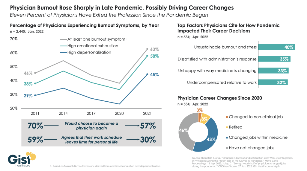 In explaining how the pandemic has impacted their career decisions, surveyed physicians list unsustainable burnout and stress as their top concern, and 11 percent say they have exited the profession, either for retirement or a non-clinical job, in the past two years.Four in ten surveyed physicians report changing jobs since 2020, mainly within similar or different practice settings, citing a desire for better work-life balance as their primary motivation. (It should be caveated that these data are from a smaller survey of 534 physicians, 40 percent of whom identified as “early career”.)