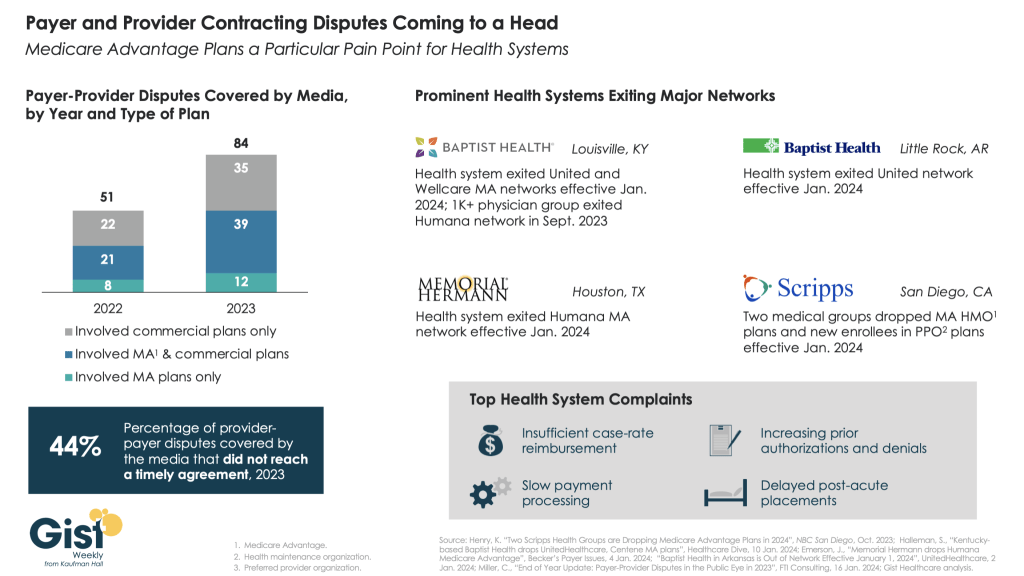 Large provider organizations—including Louisville, KY-based Baptist Health, Little Rock, AR-based Baptist Health, Houston, TX-based Memorial Hermann Health System, and two large medical groups affiliated with San Diego-based Scripps Healthdropped Medicare Advantage (MA) plans from at least one major payer, like United or Humana, as of Jan. 1, 2024.