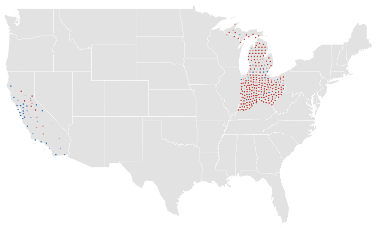 If we group the results of the 2020 presidential contest into 20-point buckets, the pattern is again obvious.