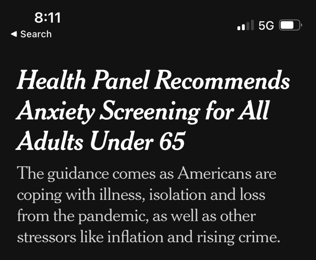 On Tuesday, the US Preventative Services Task Force (USPSTF), which is appointed by an arm of the Department of Health and Human Services, finalized guidance that all adults ages 19 to 64 should be routinely screened for anxiety, even in the absence of symptoms. Last fall, USPSTF proposed a draft version of this guidance, and also finalized its recommendation that children and adolescents ages 8-18 be screened for anxiety. The task force found that anxiety screening for seniors, as well as suicide-risk screening for all adults, lacked conclusive evidence of effectiveness.