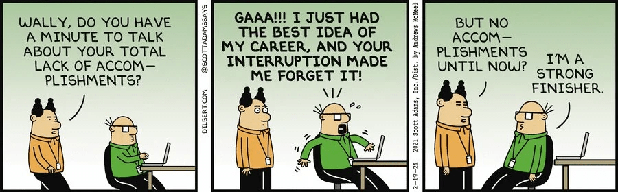 Cartoon – A Strong Finisher Posted on March 31, 2022 by henrykotula Posted in Accomplishments, Career, Cartoon, Ideas, Interuptions, Leadership, Management, Strong Leave a comment Share this: Click to share on X (Opens in new window) X Click to share on Facebook (Opens in new window) Facebook Click to share on LinkedIn (Opens in new window) LinkedIn Like Loading...