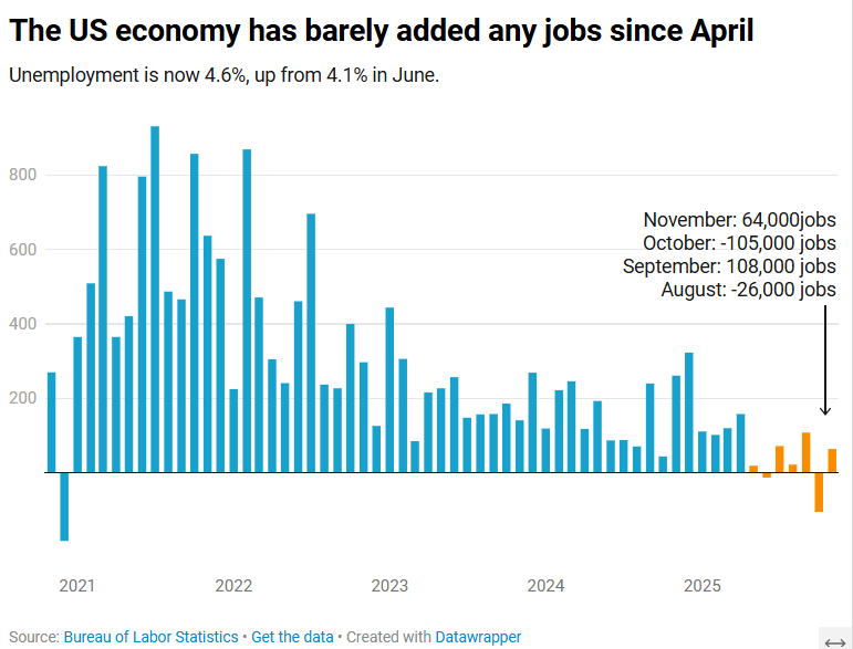 The US economy added 64,000 jobs in November as the unemployment rate crept up to 4.6%, according to Labor Department data published Tuesday.