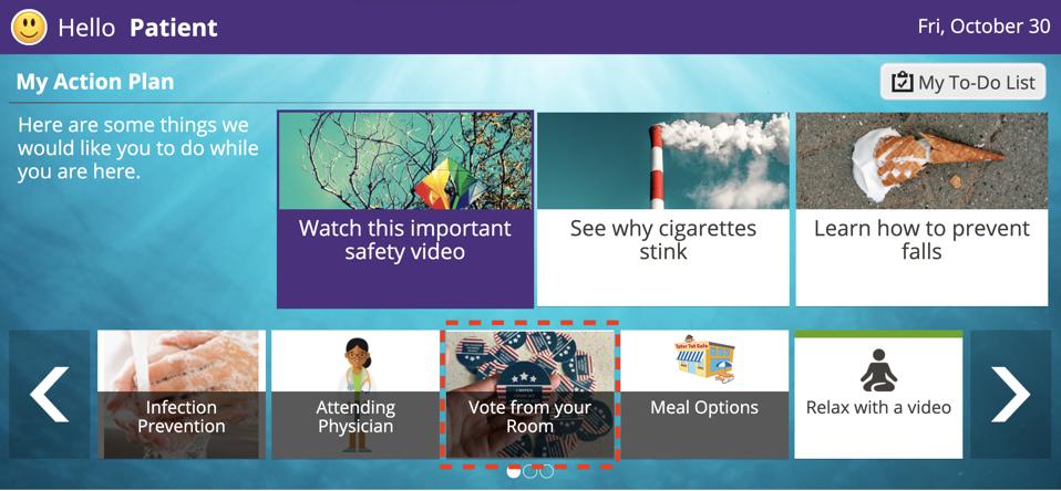 Patient Voting is getting some help to spread the word about hospital-room voting. At Hasbro Children’s Hospital, Patient Voting is newly embedded into the interface patients use to watch TV and get health and hospital information.