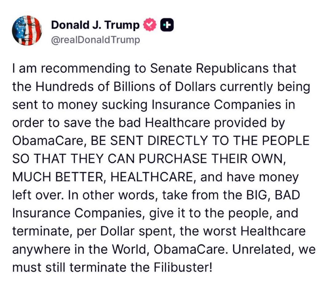 Trump’s comments are coming ahead of tomorrow’s scheduled vote in the Senate on dueling Democratic and Republican proposals to deal with the enhanced subsidies for ACA plans that will expire in three weeks. Without those subsidies, premiums will spike for many of the 24 million American enrolled in “Obamacare” plans. Democrats want to extend the subsidies for three years. Republicans, led by Senate Majority Leader John Thune, will push a plan replacing those subsidies with direct payments into individuals’ Health Savings Accounts (HSAs), as the president is suggesting. Neither plan is expected to get the 60 votes required for passage. What happens next is anybody’s guess.