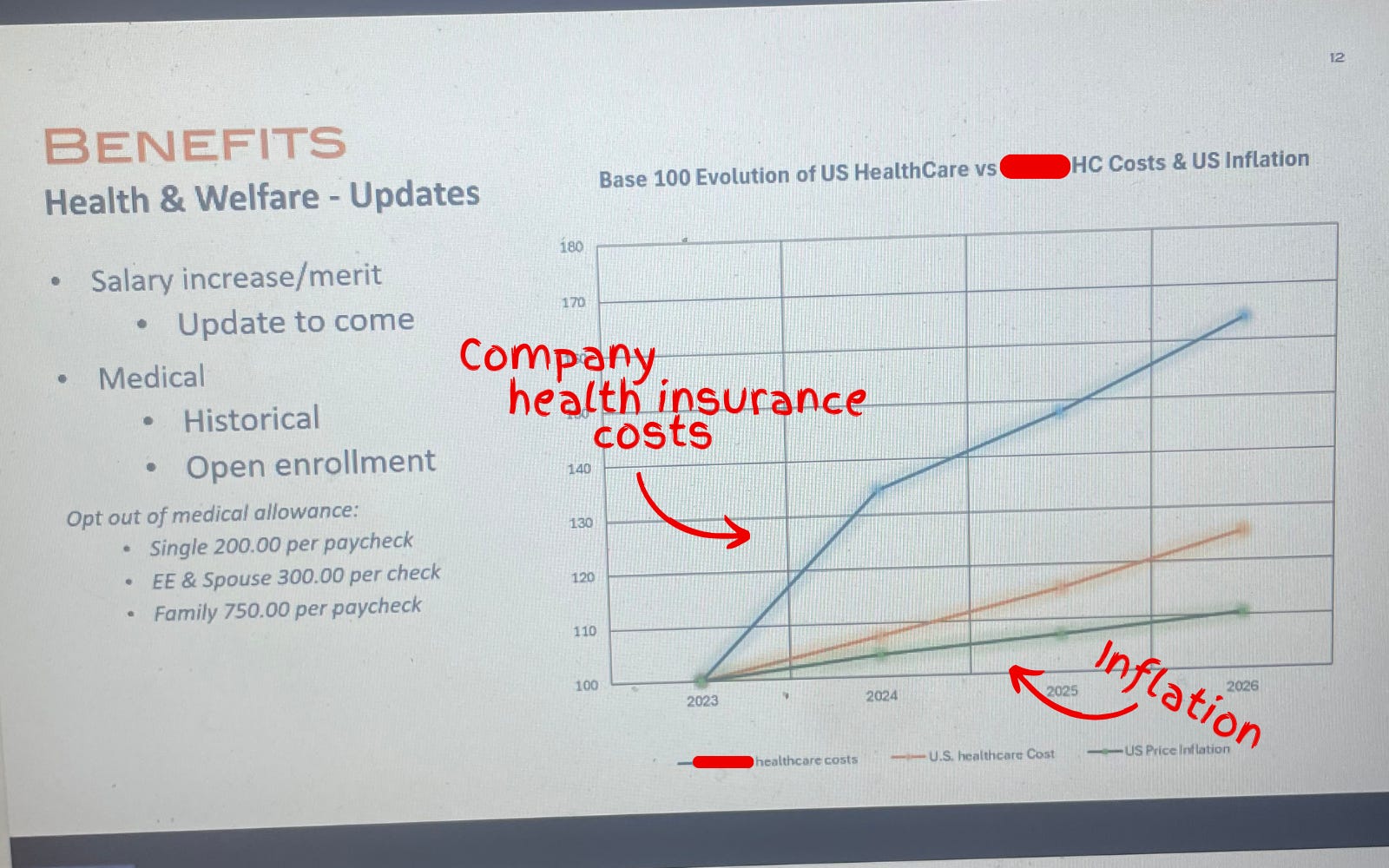 Photograph of a slide used during the company town hall showing the company’s health care costs vastly outpacing the rate of inflation.