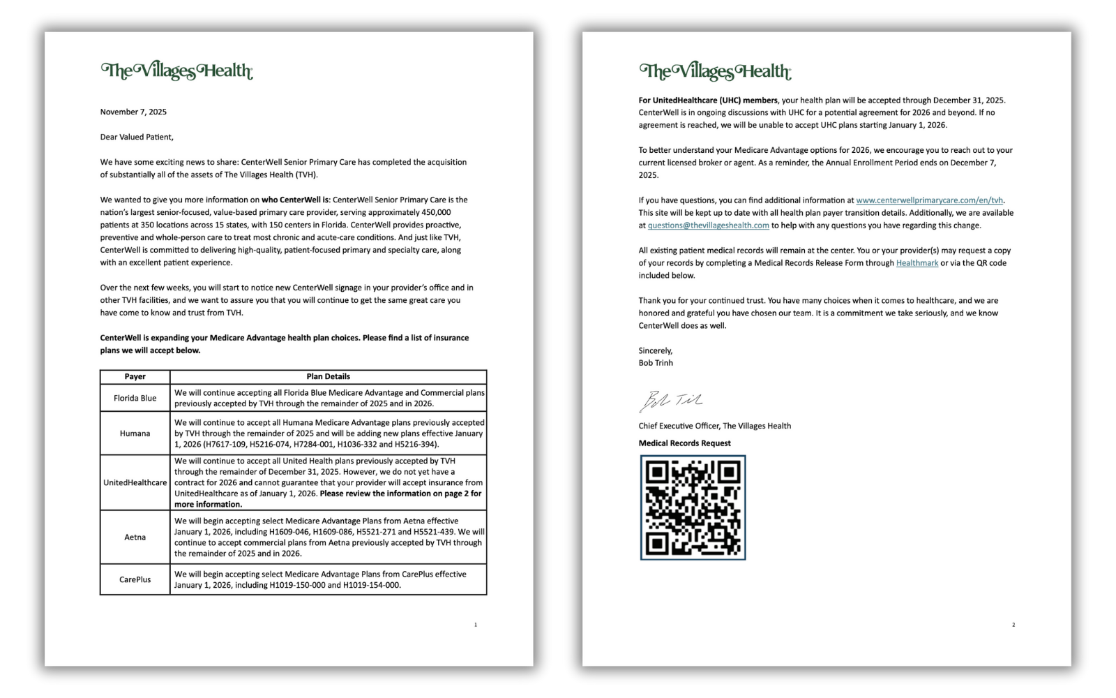 Earlier this year, The Villages Health (TVH) — the health system serving more than 55,000 retirees — promised a smooth handoff as it prepared to sell itself to CenterWell, Humana’s senior-focused primary-care chain. TVH’s CEO assured residents that “no change in care” was coming, according to News 6.
