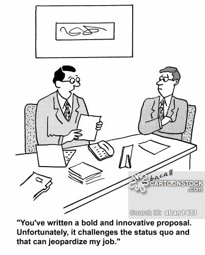 Cartoon – Status Quo Posted on February 23, 2016 by henrykotula Posted in Uncategorized Tagged Cartoon, Status Quo Leave a comment ‘You’ve written a bold and innovative proposal. Unfortunately, it challenges the status quo and that can jeopardize my job.’ Share this: Click to share on X (Opens in new window) X Click to share on Facebook (Opens in new window) Facebook Click to share on LinkedIn (Opens in new window) LinkedIn Like Loading...